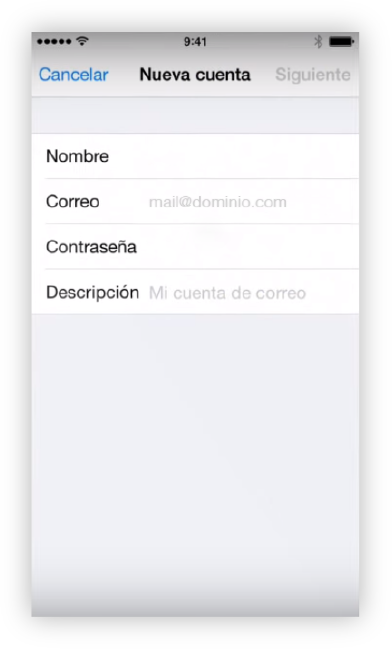 5. Nueva cuentaIntroduce tu nombre, dirección de correo electrónico, contraseña y una descripción de la cuenta. En la descripción, puede escribir algo que le permita identificar su casilla de correo. Pulsa siguiente.